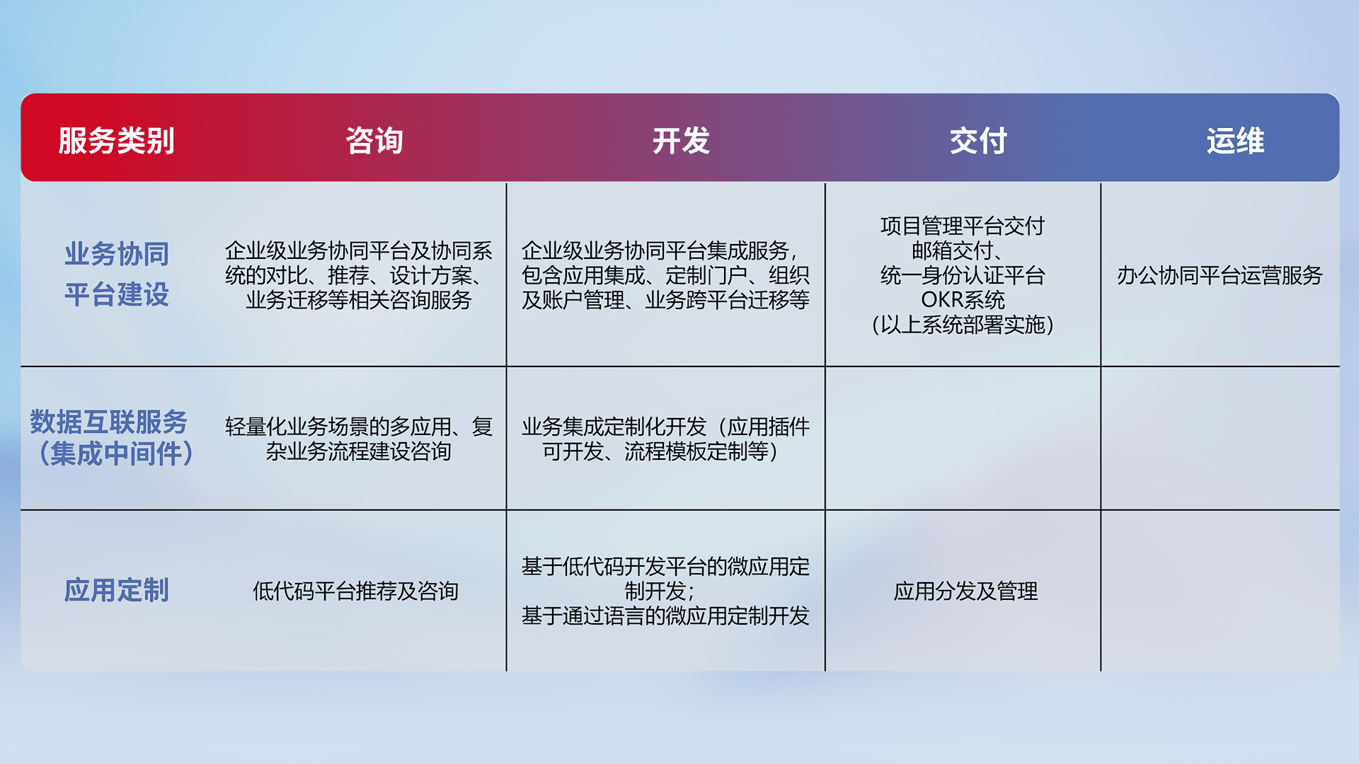 针对钉钉、、、企微、、IDaas等平台级产品提供产品的规划、、、、方案、、、、交付、、、、定制化开发等服务,,,实现如统一协同办公、、、智能客户服务、、、、混合会议管理、、、、智能数据查询、、、、等业务场景,,,,实现数字化转型。。。